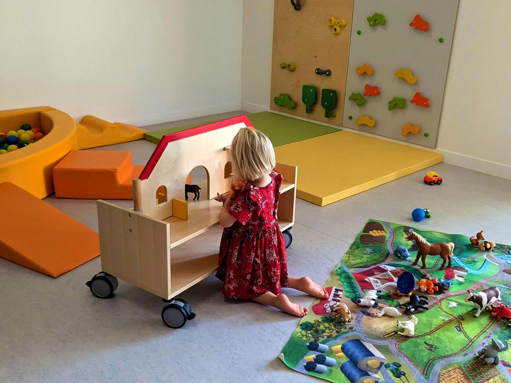 Le Jardin aux Câlins dispose d’une salle d’éveil aménagée avec du matériel confortable et modulable (mur d’escalade, piscine à balle, dinette, chevalet peinture…) qui favorise l’exploration de l’environnement dans un cadre calme et sécurisé.