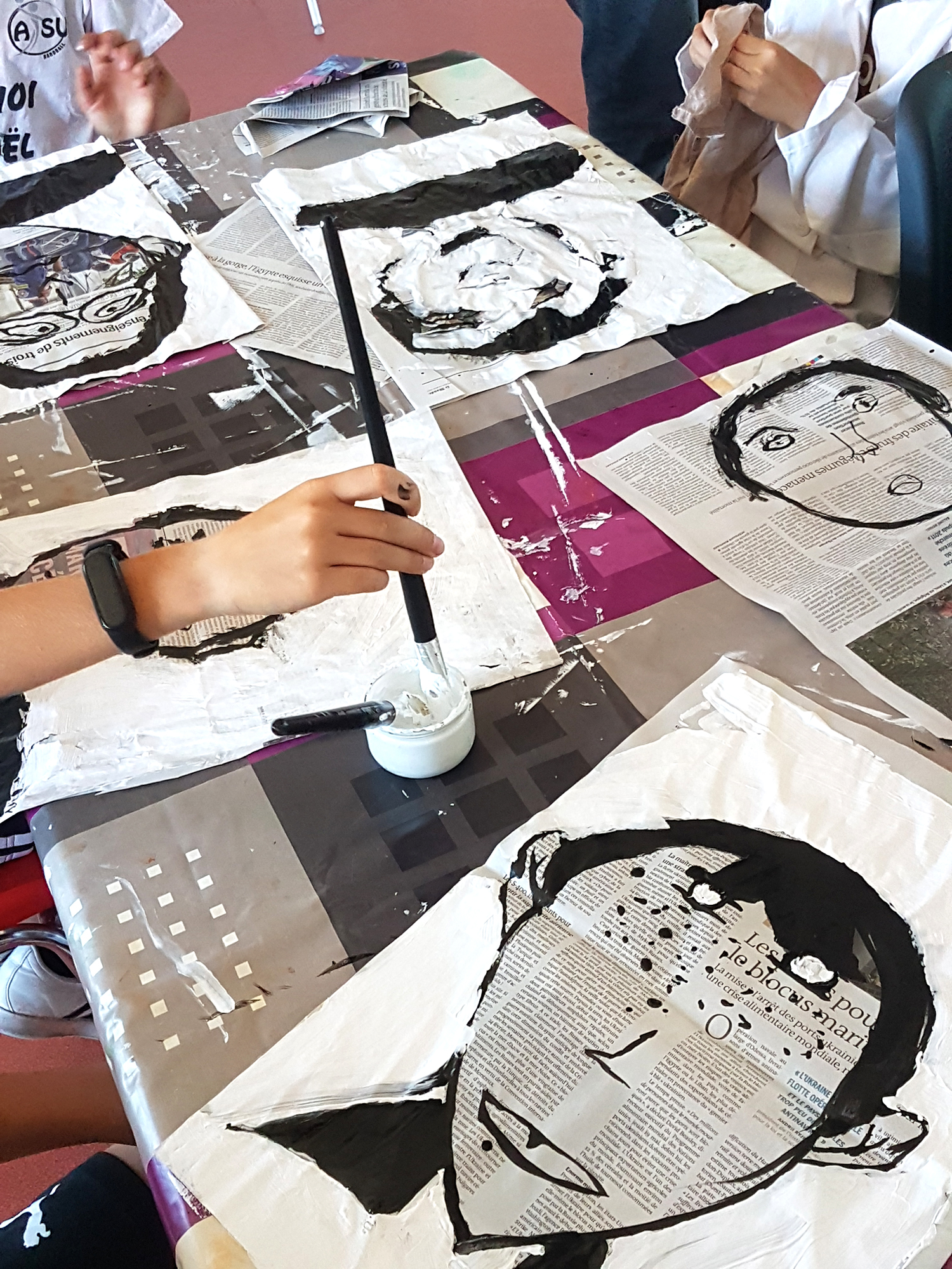 Quelques jours plus tôt, Laurent Corvaisier était parti à la rencontre de 4 classes de CM2 (Génibrat et La fontaine) afin de travailler sur un projet artistique. Les enfants ont ainsi réalisé des « portraits typographiques » sur des pages du journal « Le Monde », ils ont dessiné leur camarade à l’encre de chine (l’un faisant office de modèle, l’autre de portraitiste puis inversement). Ces portraits étaient affichés le 12 juin parmi les différentes productions contribuant à « Poétiser la ville ».